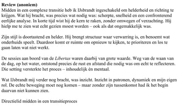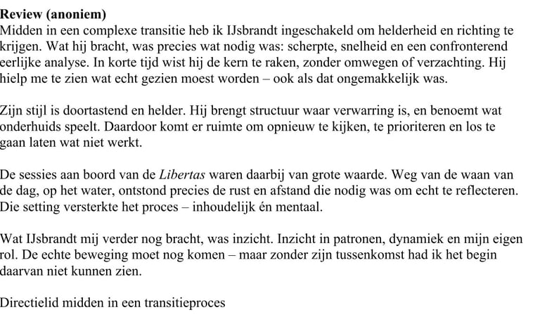Ik heb met IJsbrandt samengewerkt tijdens een offshore zonneparkproject, waar hij als Installation Manager werd ingehuurd. Vanaf dag één had hij feilloos door waar onze organisatie vastliep. Zijn vermogen om snel te doorgronden hoe structuren, belangen en menselijke dynamieken een project maken (of breken) is indrukwekkend. Toen de uitvoering stil kwam te liggen door interne besluiteloosheid, verschoof zijn rol naar die van coach. In die periode heb ik ontzettend veel van hem geleerd. Zijn aanpak is stevig, gestoeld op theorie, ervaring en een oprechte fascinatie voor wat mensen drijft. Niet alle inzichten bleven direct hangen, maar de lessen die ik heb onthouden zijn blijvend waardevol.
